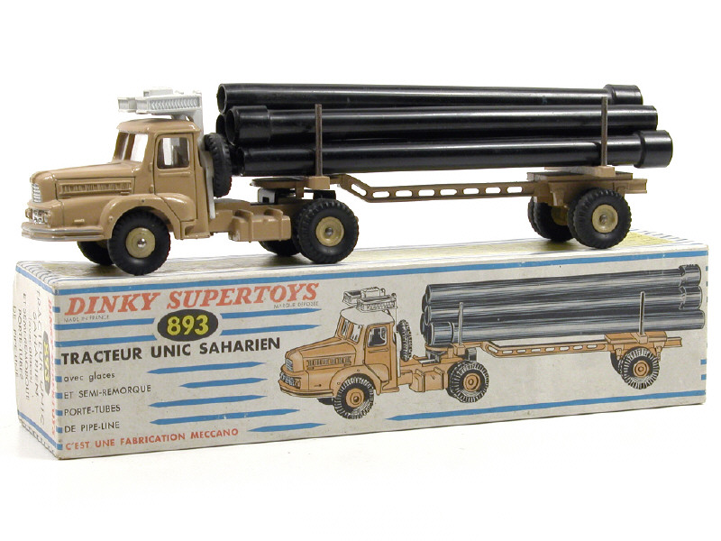 DINKY TOYS (FRANCE) 893 UNIC Saharien transport de pipe-lines (version avec jantes convexes & remorque ajourée) sable & blanc