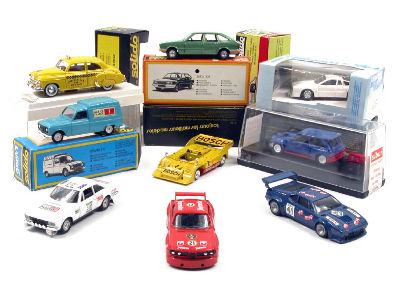 comprend : SIMCA 1308, RENAULT 4 fourgonnette 'GAZ DE FRANCE', BMW M1, PEUGEOT 504 coupé, BMW 3000 CSL, PORSCHE 917/10, LANCIA 037 rallye, CHEVROLET sedan taxi & RENAULT MAXI 5 turbo - une boîte en état 'c' - 2 modèles des marques SIBUR & VITESSE