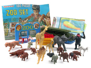 états de 'C' à 'E' - on y joint un lot important de barrière d'enclos, une entrée de zoo, 7 arbres, un diorama de jeu & un dessus de boîte incomplet 'ZOO SET' de la marque BLUEBOX