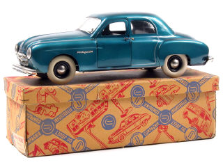 longueur 31,5 cm - version de 1955, avec moteur à pile (à revoir) & phares (fonctionnent) - calandre à une barre - porte conducteur ouvrante - notice collée à l'intérieur du couvercle - SUPERBE !