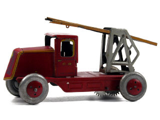 longueur 18 cm - moteur à ressort (fonctionne) - version avec cabine fermée, roues de type sport & sans pompier - échelle & son support légèrement déformés