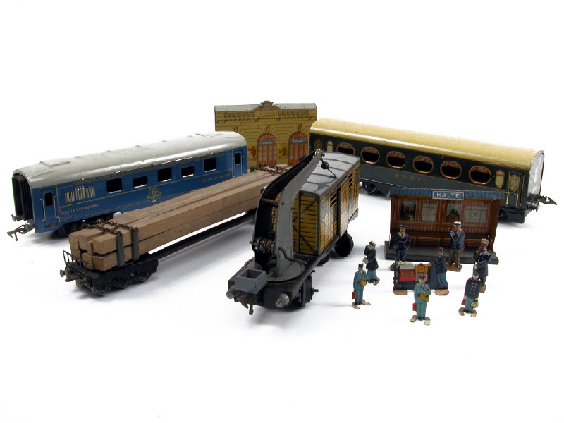DIVERS (Ecartement O) Ensemble de 2 voitures de voyageurs, 2 wagons de marchandises, une halte, une petite façade de gare & 8 figurines