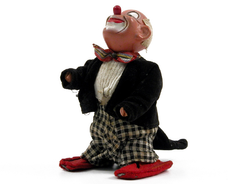 hauteur 15 cm - moteur à clef (fonctionne) - avec clef - en action, le clown saute en arrière & retombe sur ses pieds (de manière aléatoire) - manque mains, corde à sauter & perruque - tissu faisant office de chaussures en partie élimé