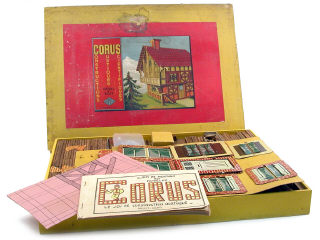dimensions du coffret : 54.5 x 40 cm - comprend différents éléments en bois & en tôle lithographiée permettant de construire différentes maisons - avec notice & plan - semble complet - quelques traces d'oxydation sur les éléments en tôle