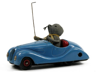 longueur 14,5 cm - moteur à clef (fonctionne) - avec souris au volant tenant une canne & agitant ses bras lorsque la voiture roule - quelques petits manques - un léger enfoncement à l'arrière de la carrosserie