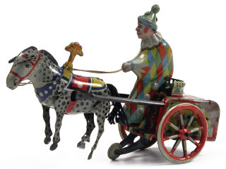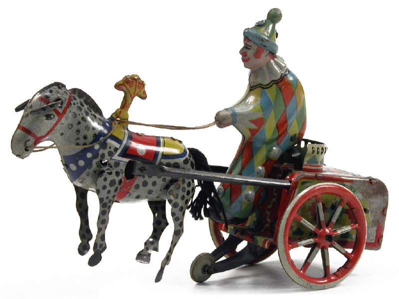 longueur 19 cm - moteur à ressort (fonctionne) - en action, le clown saute sur son siège tandis que la carriole avance