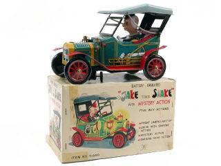 longueur 23 cm - moteur à piles (fonctionne) - en action, le tacot avance en contournant les obstacles tout en brinquebalant - avec lanterne lumineuse (une ampoule à revoir)