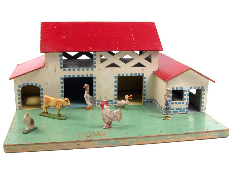 dimensions : 53,5 x 41 x 24,5 cm - fabrication des années 50 - on y joint 5 animaux & un personnage (tête recollée) - manque 2 socles sur 2 animaux