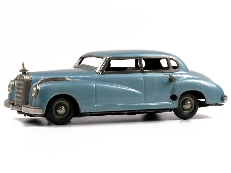longueur 24 cm - moteur à clef (fonctionne) - version avec direction commandée par le bouchon de radiateur, entourage des vitres latérales & pare-brise chromés, enjoliveurs d'ailes avant & levier de commande du moteur sous la forme d'une poignée de portière à l'arrière gauche - petites déformations à l'arrière du plancher