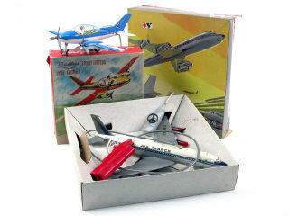 envergure 46,5 cm - un aileron arrière & antenne cassés - fêlure sur une aile - moteur à piles (à revoir) - avec direction - manque un embout de réacteur - traces de ruban adhésif sur le train avant & la dérive arrière