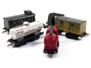états de 'B' à 'C' - comprend : un fourgon à bagages, un wagon de secours (petites traces d'oxydation sur les attelages), un foudre-double & un citerne 'STEF'