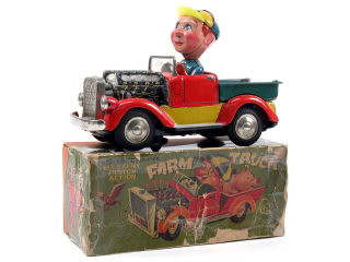 longueur 24 cm - en action, le véhicule zigzague, le conducteur tourne la tête de droite à gauche & les pistons du moteur s'actionnent - avec éclairage - tous les mécanismes fonctionnent - manque chargement