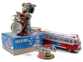 hauteur 24 cm - en action, l'éléphant joue de la batterie avec ses mains & ses pieds tandis qu'il bouge la tête & que ses yeux s'allument - tous les mécanismes fonctionnent - avec boîte fac-similé