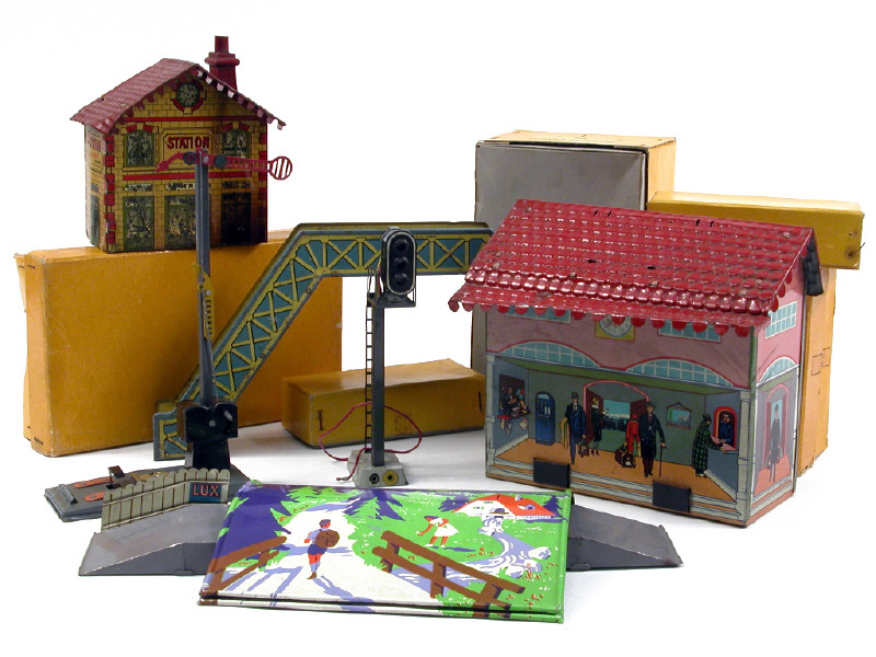 états de 'A' à D' - comprend : une gare en tôle lithographiée (de marque indéterminée, avec manques), une station, une passerelle (de la marque HORNBY), un tunnel, une petite gare, un heurtoir, 2 signaux à feu fixe & un sémaphore - 5 éléments avec boîte - on y joint : 2 heurtoirs & un wagon citerne 'SHELL' en écartement HO de la marque avec boîte