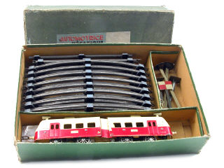 moteur à clef (fonctionne) - importantes retouches - manque ampoule d'éclairage - le coffret contient 10 rails & 5 éléments de signalisation