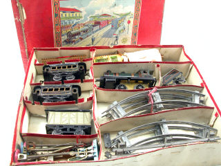 production de 1922-1929 - contient : une locomotive à vapeur de type 120 avec tender (moteur à clef fonctionne), 2 voitures de voyageurs, un fourgon à bagages, une station, un réservoir d'eau sur pied, un passage à niveau, 2 poteaux télégraphiques, 2 lampadaires, 4 signaux (un avec socle manquant), un poste de contrôle sur pieds (dessoudé de sa base), 6 rails courbes, 2 rails droits & clef - les voitures de voyageurs sont en état 'C' - quelques traces d'oxydation - TRES BEL ASPECT GENERAL POUR UN MODELE DE CETTE EPOQUE !