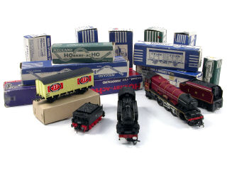 comprend : un locomotive vapeur type 131 avec tender, une locomotive vapeur type 231 'PRINCESS ELIZABETH' avec tender (de fabrication britannique), un wagon à bagages, un wagon-fourgon 'EVIAN', un wagon-fourgon 'BIERE 33 EXPORT', un wagon à trémie, un wagon-fourgon de queue, un wagon- tombereau, un wagon-plateau porte-essieux, un wagon-transport d'automobiles, 3 wagons-citernes 'TOTAL', 'SHELL' & 'ESSO' - on y joint une boîte de 3 wagons-plateaux de la marque japonaise TER - les 2 locomotives & un wagon sont sans boîte