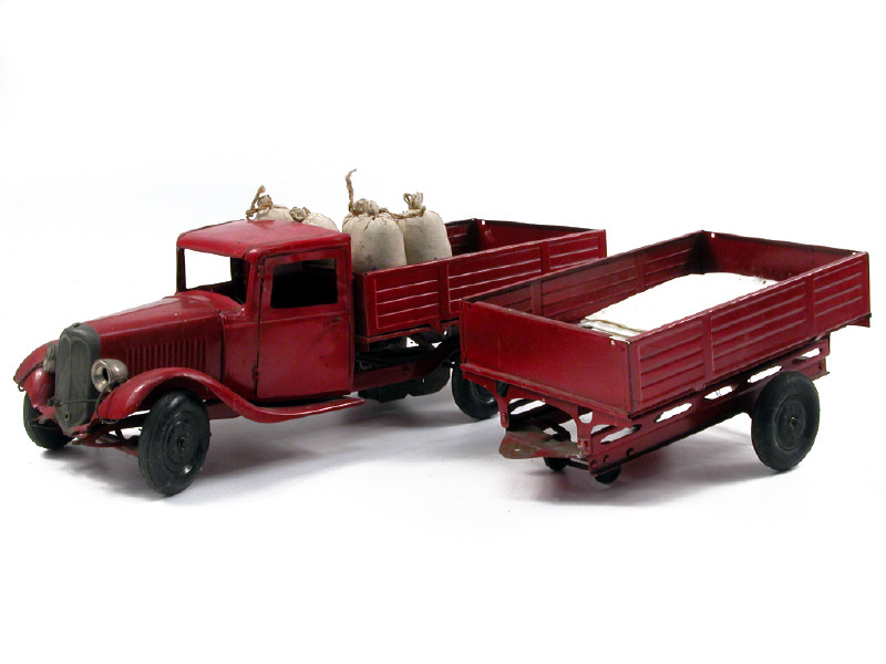 longueur 75 cm - fabrication de 1936-1939 - moteur à clef (fonctionne) - avec direction - quelques traces d'oxydation sur le moteur & les axes de roues - manque pare-chocs avant, cerclage de volant, fixation arrière de l'attelage, ampoules de phares , bouchon de radiateur & poignée de porte - avec 5 sacs CITRÖEN - on y joint 18 sacs à plat en tissu non d'origine