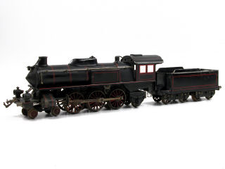 longueur 64 cm - fabrication vers 1915 - moteur électrique (non testé) - 2 fixations non d'origine sur les boggies - manque lanterne à l'avant de la chaudière, ampoules & 3 butoirs (dont 2 sur le tender) - traces d'oxydation - verni craquelé - TRES BEL ETAT DE PRESENTATION POUR UN MODELE AUSSI RARE !