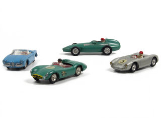 comprend : PORSCHE SPYDER, ASTON MARTIN 3L, VANWALL F1 & ALFA ROMEO GIULIETTA SPIDER - 2 petites perforations non d'origine sur le plancher de 2 modèles - manque une conductrice