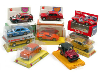 miniatures reproduisant les modèles : VOLKSWAGEN, RENAULT, MASERATI, FORD, JEEP, ALFA ROMEO & FERRARI - un modèle de la marque POLISTIL - une boîte en état 'c'