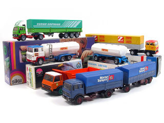 SIKU (ALLEMAGNE) 3116 VOLVO F10 Turbo 6 semi-remorque plateau à ridelles basculantes bâché 'TURBO EXPRESS' 2 tons de vert & rouge