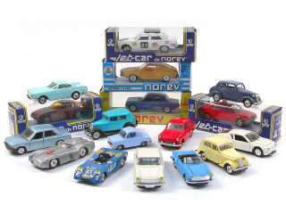 états de 'A' à 'C' - miniatures reproduisant les modèles : RENAULT, PEUGEOT, VOLVO, SIMCA, VOLKSWAGEN, CHEVRON, VESPA, MERCEDES, FIAT & PORSCHE - 5 modèles en boîte - quelques carrosserie légèrement déformées - petits détails de peinture ajoutés sur un modèle