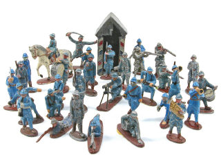 états de 'D' à 'R' - comprend : 2 soldats avec fusil sur l'épaule, 2 à la charge, un à genoux, un au 'présentez arme', 2 avec masque à gaz, 6 tireurs, 8 musiciens, 4 officiers, 2 porte-étendards, un muletier, 2 pourvoyeurs & un grenadier - avec manques - on y joint une guérite de marque indéterminée