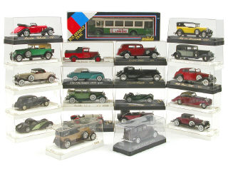 série AGE D'OR - miniatures reproduisant les modèles : CADILLAC, CITROËN, RENAULT, BUGATTI, ALFA ROMEO, CORD, DELAHAYE, HISPANO SUIZA, PACKARD, DUESENBERG, JAGUAR, MERCEDES, FIAT, ROLLS ROYCE, PANHARD, DODGE & FORD - une boîte non d'origine - un véhicule sans boîte & un autre avec socle de boîte manquant - petits manques