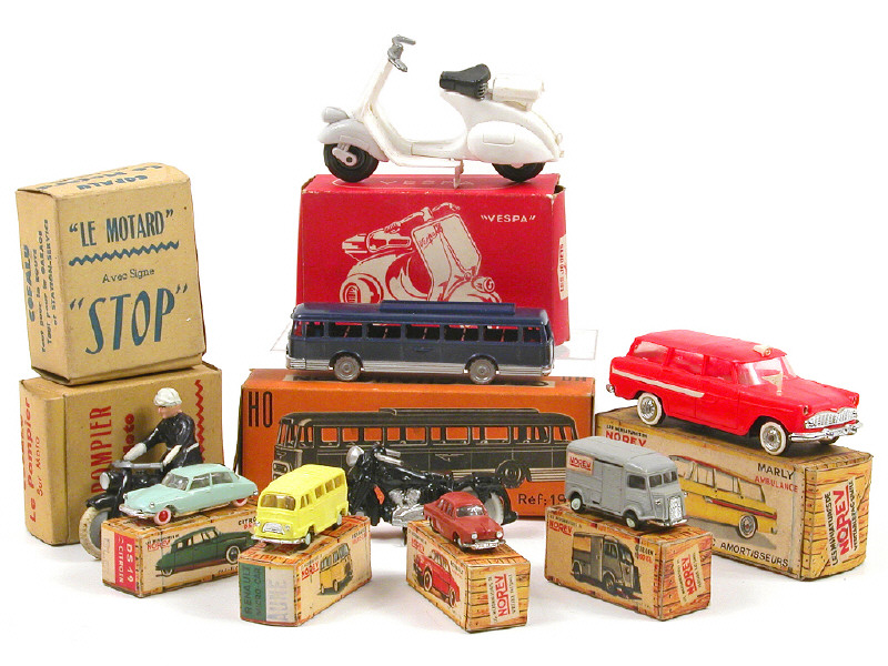 miniatures reproduisant notamment les modèles : SIMCA, CITROËN, RENAULT, CHAUSSON & VESPA - on y retrouve notamment les marques : NOREV, MICROMINIATURES NOREV, JOUEF, B.S. & COFALU - 2 boîtes en état 'c', une en état 'd' & 2 autres non conformes aux véhicules - manque un fanion d'aile & une béquille de moto