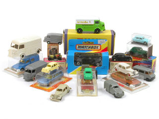 on y retrouve notamment les marques : CLE, BREKINA, CORGI, MATCHBOX, MINICARS, MAJORETTE, PRALINE & NOREV - une boîte en état 'c' & une autre en état 'd' - petits manques - on y joint un taille-crayon