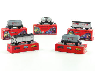 comprend : 2 wagons céréaliers, un wagon foudre-double 'C.E.T.', un wagon-fourgon 'EVIAN' & un wagon frigorifique 'INTERFRIGO'