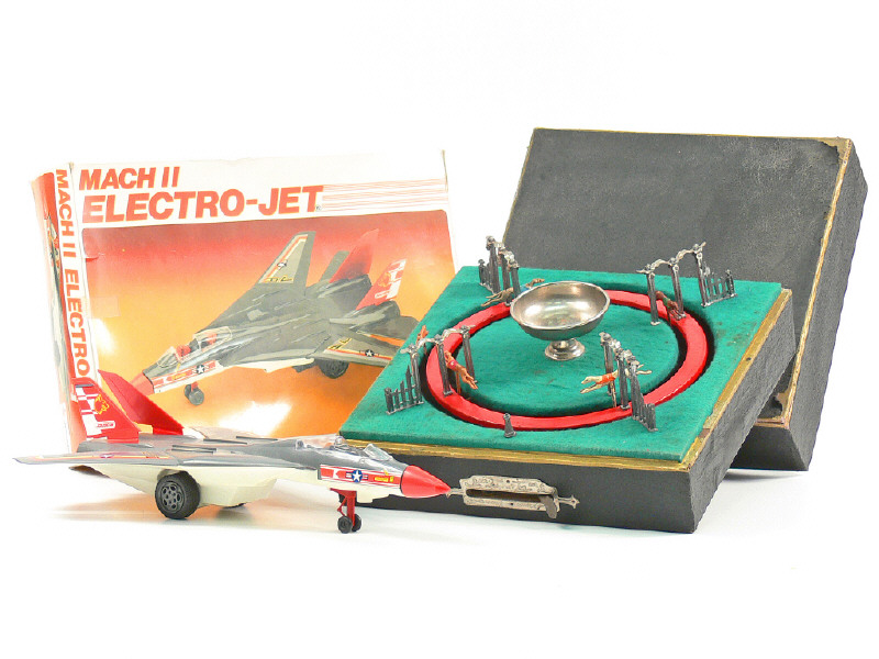 envergure : 27 cm - moteur à piles (fonctionne) - manque pilote & couvercle du logement des piles - par pression de l'appareil au sol, un bruitage de turbines annonce un démarrage en trombe