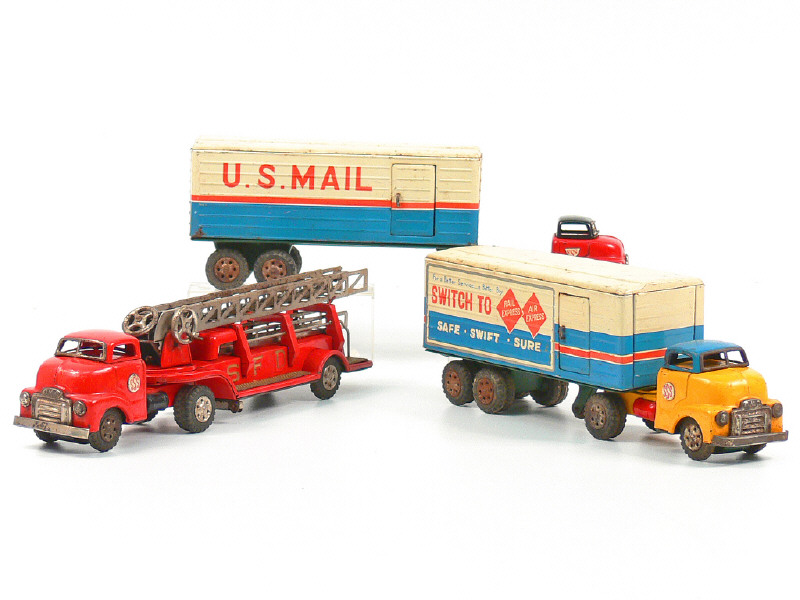 comprend : 2 semi-remorques de transport & un autre grande échelle de pompiers - traces d'oxydation - moteur à friction (à revoir) - un tracteur non conforme à la remorque
