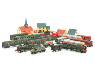 états de 'B' à 'D' - comprend : 3 locomotives à vapeur, 3 voitures de voyageurs, 13 wagons, une Micheline (en boîte), 4 transformateurs, des maquettes de bâtiments & des accessoires - quelques manques