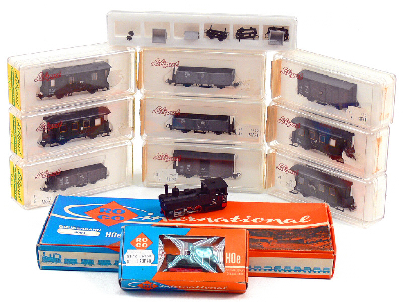 comprend : 5 wagons de marchandises, 3 voitures de voyageurs, un fourgon à bagages & une locomotive à vapeur type 031 - on y joint une locomotive diesel 0-16V & un coffret incomplet avec une locomotive à vapeur type 030 & 8 wagons-bennes de 2 types différents de la marque ROCO (HOe)