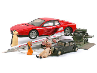 DIVERS Ensemble de 2 voitures, un avion, une machine à écrire, des petites poupées & peluches
