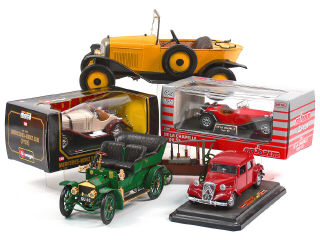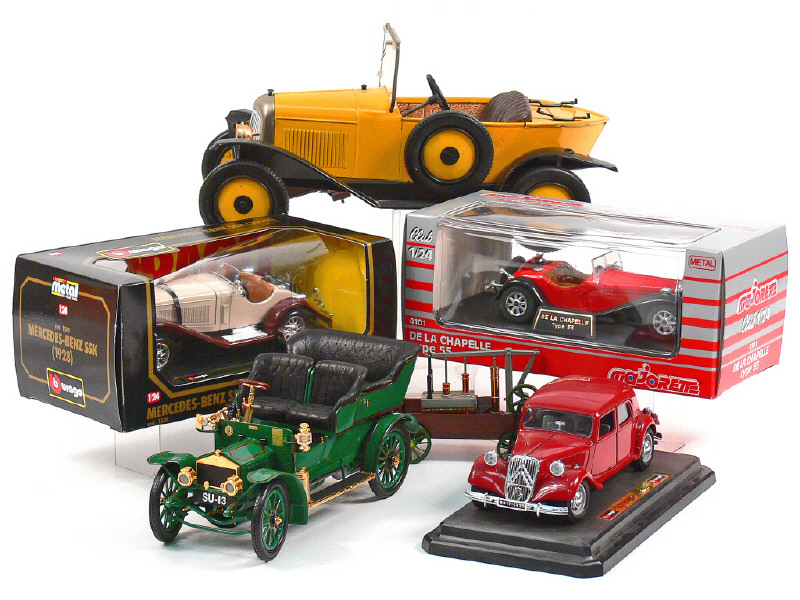 échelle 1/24ème - sur socle de présentation - avec direction par le volant - on y joint un véhicule amphibie à vapeur de la marque BRUMM en état 'C' avec quelques parties cassées & recollées ainsi que quelques petits manques