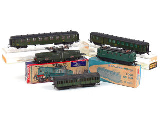 états de 'A' à 'C' - comprend : une motrice électrique BB12.061, une motrice électrique BB8144, une voiture de voyageurs 2ème classe, une voiture mixte 2ème classe & une voiture de voyageurs 3ème classe (petites traces d'oxydation) - on y retrouve les marques : HORNBY, FRANCE TRAINS & SMCF - 4 modèles avec boîte
