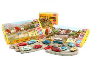 états de 'A' à 'F' - comprend notamment : CITROËN DS, JAGUAR E, MERCEDES 190SL, MERCEDES 220, PORSCHE 908, PORSCHE 911, VOLKSWAGEN COCCINELLE, FIAT 2300, un transformateur, une tour de contrôle & des rails de différentes tailles - 3 éléments avec boîte