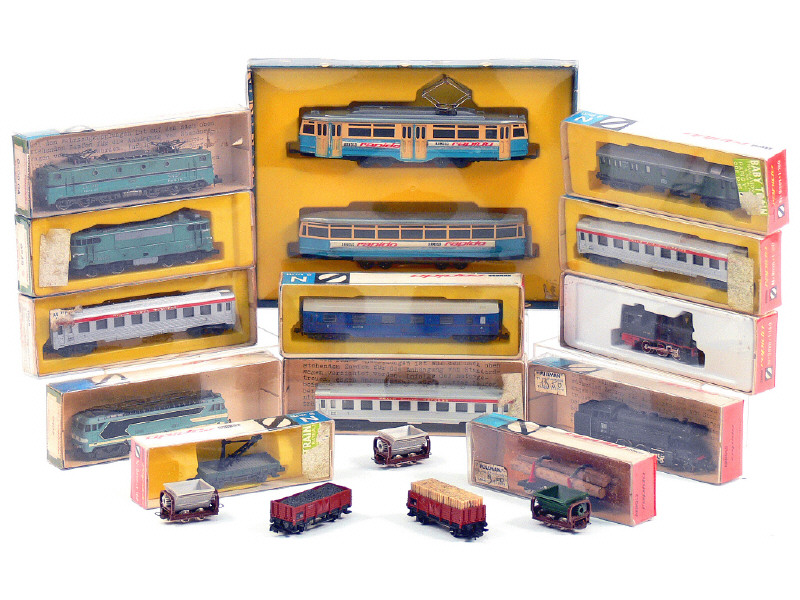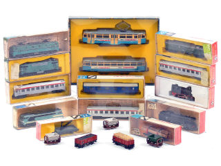 états de 'A' à 'C' - comprend : une locomotive à vapeur type 132, une locomotive à vapeur type 030, une motrice électrique type CC 7107, une motrice électrique type BB9201, une motrice diesel type 67001, une motrice type 'boîte à sel', 5 voitures de voyageurs, un fourgon à bagages, 16 wagons de marchandises & un tramway à 2 éléments - quelques notices présentes - 9 wagons sans boîte