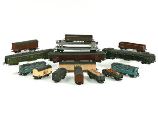 états de 'A' à 'B' - comprend : une voiture de voyageurs, un fourgon à bagages, un wagon-postes, 3 wagons-tombereaux dont un avec chargement, 5 wagons-fourgons, un wagon-transport de voitures (rambardes cassées & incomplètes), un wagon-plateau à ridelles basses avec chargement de tonneaux & 2 wagons-chaufferie - on y retrouve notamment les marques : ELECTROTRAIN, SMCF, GéGé, SPMR, FRANCE TRAINS, PIKO & BUCO - petites traces d'oxydation