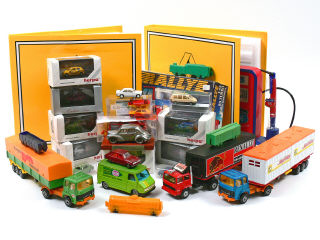 états de 'A' à 'C' - on y retrouve notamment les marques : SOLIDO, MAJORETTE, HERPA, PRALINE, HELLER & CIJ - on y joint 2 façades à monter de la marque NOREV, une pompe à essence publicitaire avec stylobille & 4 wagons de marque indéterminée