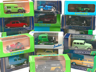 miniatures reproduisant les modèles : BENTLEY, BUGATTI, CHEVROLET, CITROËN, FORD, HOTCHKISS, PANHARD, PEUGEOT, RENAULT, ROLLS ROYCE, SIMCA & TALBOT - 2 modèles de la marque LEADER