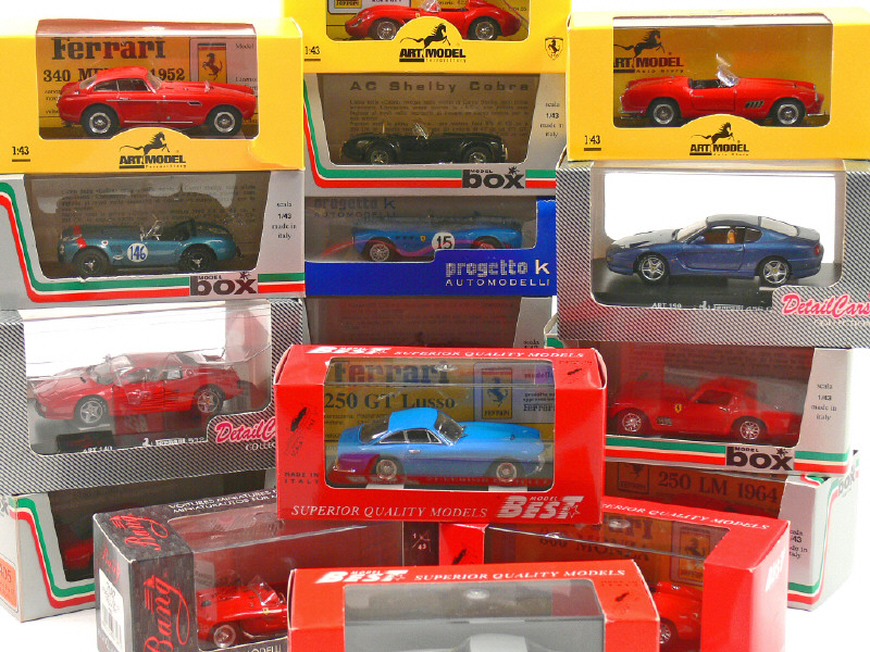 miniatures reproduisant les modèles : FERRARI, ALFA ROMEO, AUSTIN & AC - on y retrouve les marques : BANG, ART MODEL, MODEL BEST, DETAIL CARS, MODEL BOX, PROGETTO K & IDEA 3