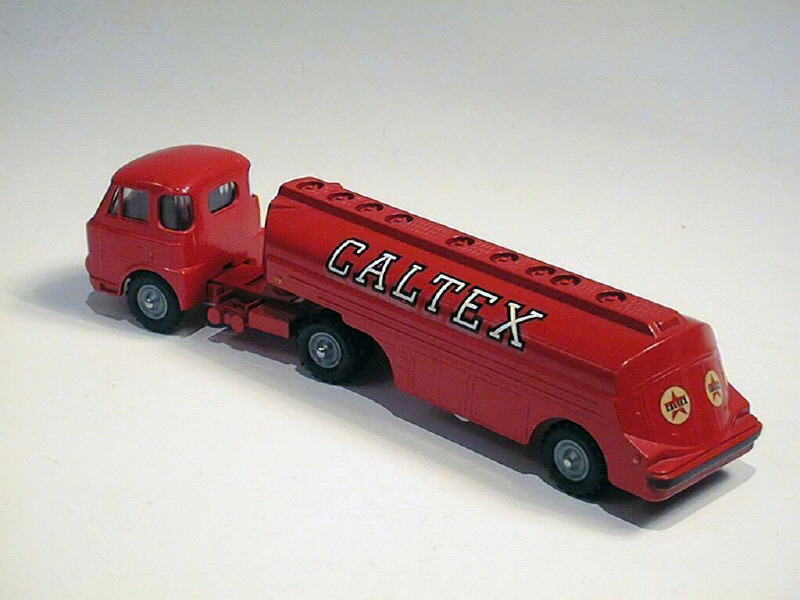 la base est une version calandre à 3 barres - une légende accompagne ce modèle - Est-ce un prototype ou un promotionnel ? - Beaucoup en ont parlé, très peu l'ont déja vu.... Le mystère reste entier - A l'origine, ce camion faisait partie d'une collection thématique de citernes, réalisée dans les années 60, dont le propriétaire est aujourd'hui décédé - Le fait que la roue de secours n'ait jamais été montée, et que l'emplacement correspondant ne fait état d'aucune trace (la pointe fixant en force la roue de secours, faisant toujours apparaître un petit éclatement du zamac), laisserait à penser qu'il s'agit d'un prototype - Ceci serait conforté par le fait que la peinture de ce modèle est incontestablement d'origine, et que les camion-citernes CALTEX étaient bien rouge uni - de plus, ce projet de véhicule promotionnel aurait pu être abandonné, du fait de l'intégration de CALTEX, par ELF en 1967 - EN TOUT ETAT DE CAUSE, CETTE PIECE RESTERA DANS LES ANNALES !!!