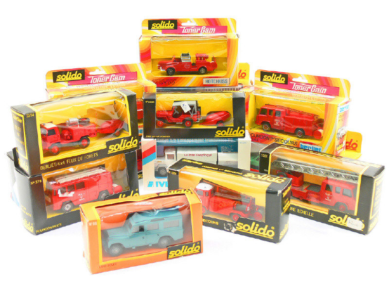 miniatures reproduisant les modèles : BERLIET, HOTCHKISS, SAVIEM, JEEP, LAND ROVER, PEUGEOT, IVECO, TALBOT SIMCA & RENAULT - détails de peinture ajoutés sur quelques véhicules - roues remplacées sur une voiture - 10 véhicules de pompiers & un modèle de la série MAXICAR