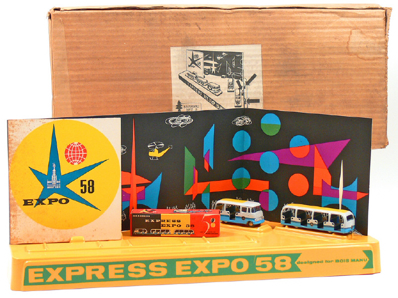 BOIS MANU (BELGIQUE) Diorama de présentation 'EXPRESS EXPO 58' jaune d'or, noir, orange & mauve