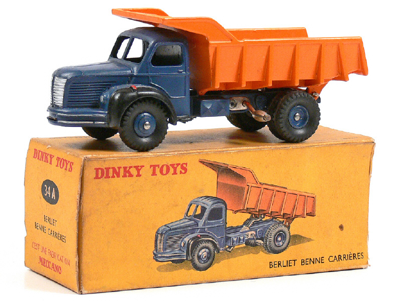 DINKY TOYS (FRANCE) 34A BERLIET Benne carrière MARREL (version avec jantes convexes) bleu foncé & orange