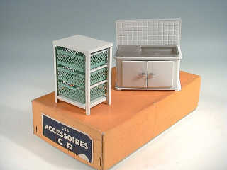 comprend un meuble-évier & meuble à légumes - ces superbes miniatures ont été les dernières fabrication de la marque avant la fermeture de l'usine vers 1960